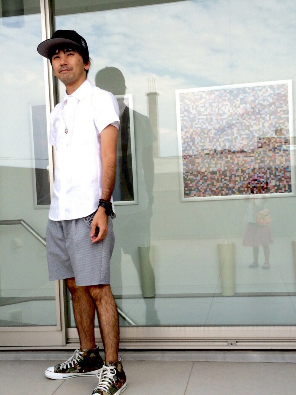 堅くなってしまう白シャツを、キャップやショーツ、スニーカーで崩したコーディネート。 自邸の屋上にて撮影。 ガラスに映り込んでますが、4歳の娘に撮影してもらいました^ ^