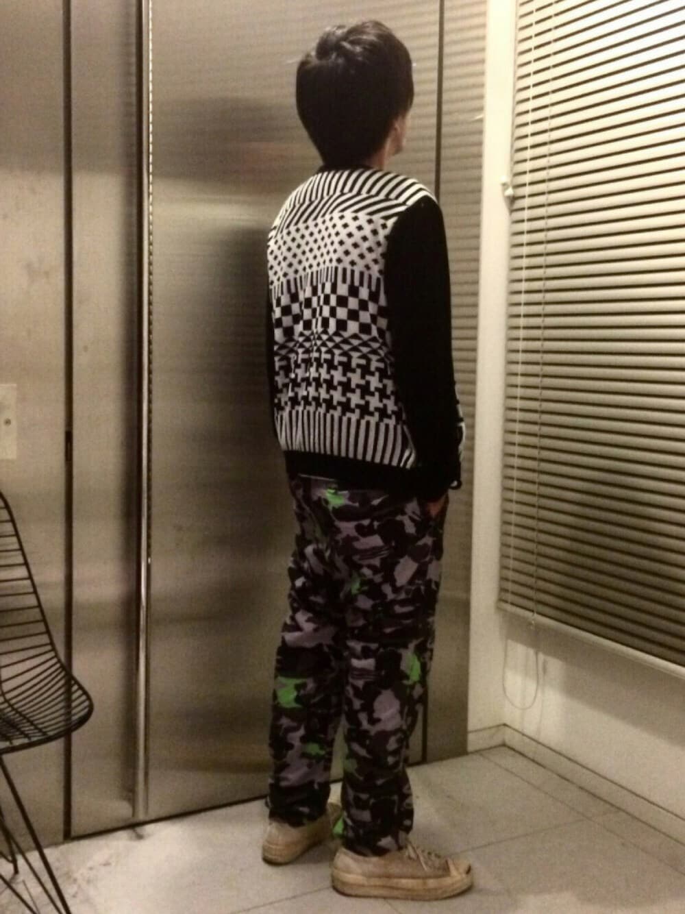 暑かったり寒かったり、今の時期はカーディガンが大活躍してます。 太陽の光で色が変わるアンリアレイジのフォトクロミックカーディガン、着ていてとても面白い。 アンリアレイジのポイントカラーアーミーパンツを合わせて、さらに色を楽しむコーディネートに。 自邸エントランスにて撮影。