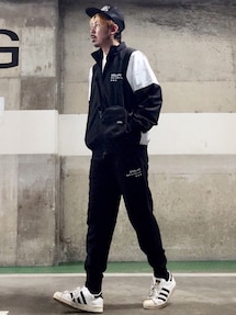 MasaakiOoueのブルゾン「ロゴプリントナイロンジャケット」を使ったコーディネート