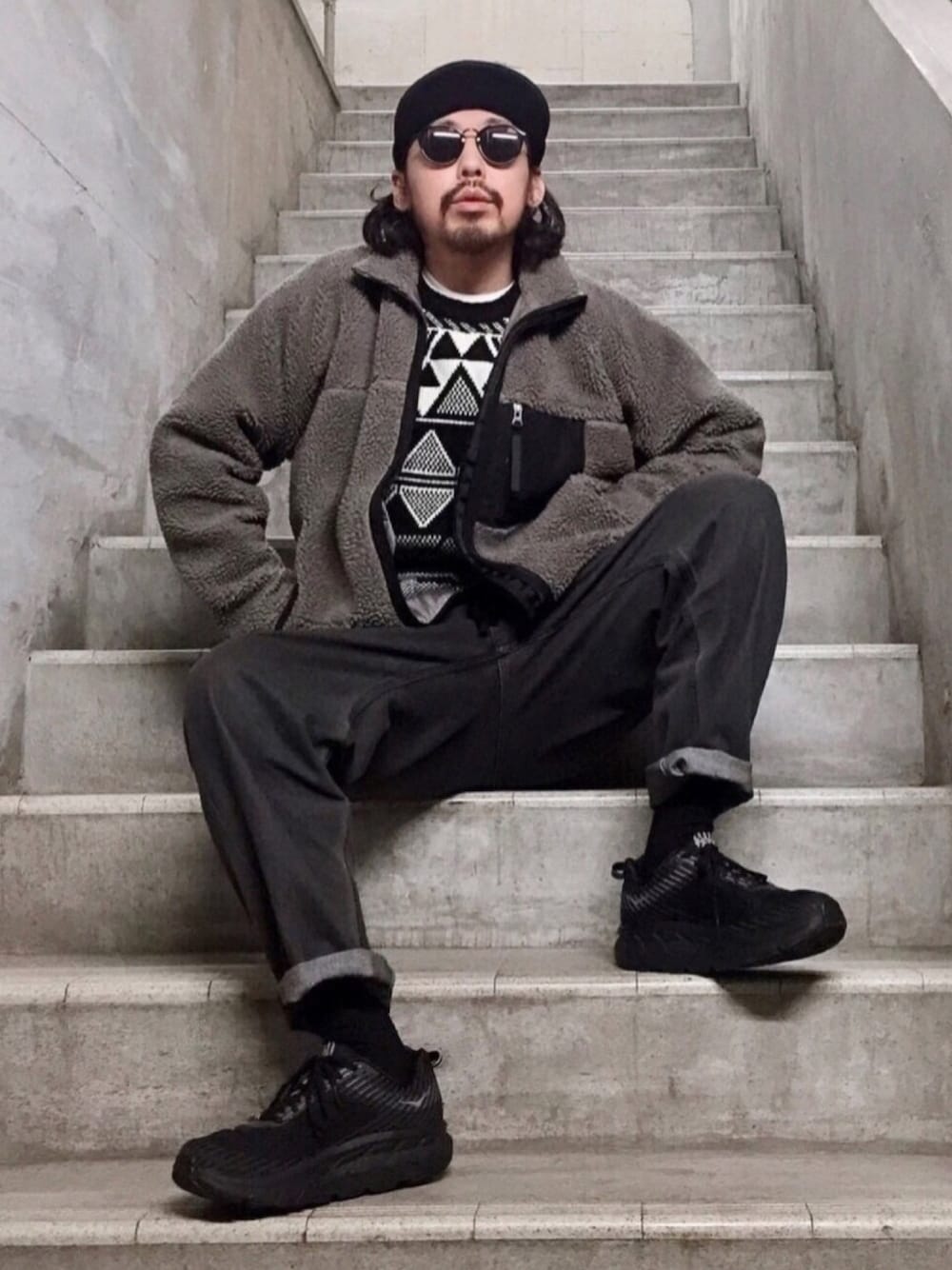 はーい皆んなお疲れさん🙌 まさあきさんやで😉✨ いいね、お気に入り、フォロー、そしてフォルダーイン、みんないつもありがとうねー😎🙏✨ コメ欄が閉じてる日はインスタのコメやDMで気軽に絡んでねー😎👍✨ はじめましてちゃんも遠慮無く😎👍✨ PR、お仕事、のご依頼もインスタDMでよろしくです✨ さぁ! 今日のコーデは ヒューストンのボアフリースジャケットを柄ニットとバルーンデニムで合わせたモノトーンカジュアル😎🙏 モノトーンにグレーもしっかり含めて、柄ニットを取り入れる事で、モノトーンが単調にならないように工夫😎🙏✨ スニーカーはホカオネオネのクリフトン をチョイス✨