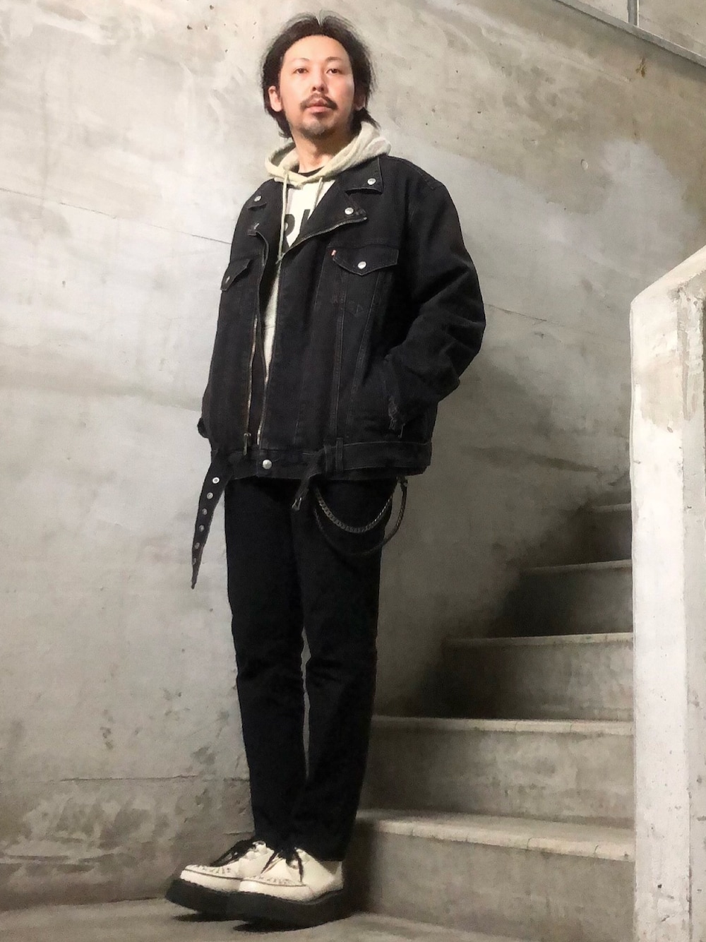 "Levi'sから新発売される新作アイテムのキャンペーンに参加させて頂き、着用させて頂きました" と言う訳で はーい皆んなお疲れさん🙌 まさあきさんやで😉✨ いいね、お気に入り、フォロー、そしてフォルダーイン、みんないつもありがとうねー😎🙏✨ コメ欄が閉じてる日はインスタのコメやDMで気軽に絡んでねー😎👍✨ はじめましてちゃんも遠慮無く😎👍✨ PR、お仕事、のご依頼もインスタDMでよろしくです✨ さぁ! 今日のコーデは "Levi's HYBRID TRUCKER ジャケット" を使用したパンクロックコーデ😎🙏✨ この"Levi's HYBRID TRUCKER ジャケット"はダブルライダースとトラッカーデニムジャケットのハイブリッドやね😀✨ カラーは一応グレーて事になってるみたいやけど、洗いをかけたブラック!て感じでビンテージ感あるカラーが絶妙😎🙏✨ こなれ感が出るよね😎👍 しっかりとした生地感や縫製もさすがリーバイス !😎👍✨ これからの季節にピッタリで、古着、アメカジ、モード、ストリートetc なんにでも合わせれそうでコーデ組が楽しくなりそう😎👍✨ さぁみんな リーバイスにきがえよう! 😎👍✨