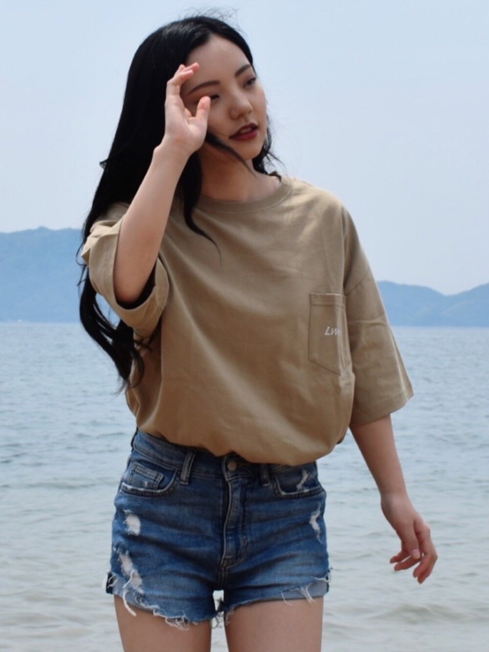 LWONDより 今日のコーデはポケットTシャツです トレンドのベージュカラーで可愛い仕上がりになっています オリーブやブラックもあり、ユニセックスなスタイリングです! 少しゆるっと着るのが可愛く着るポイントです