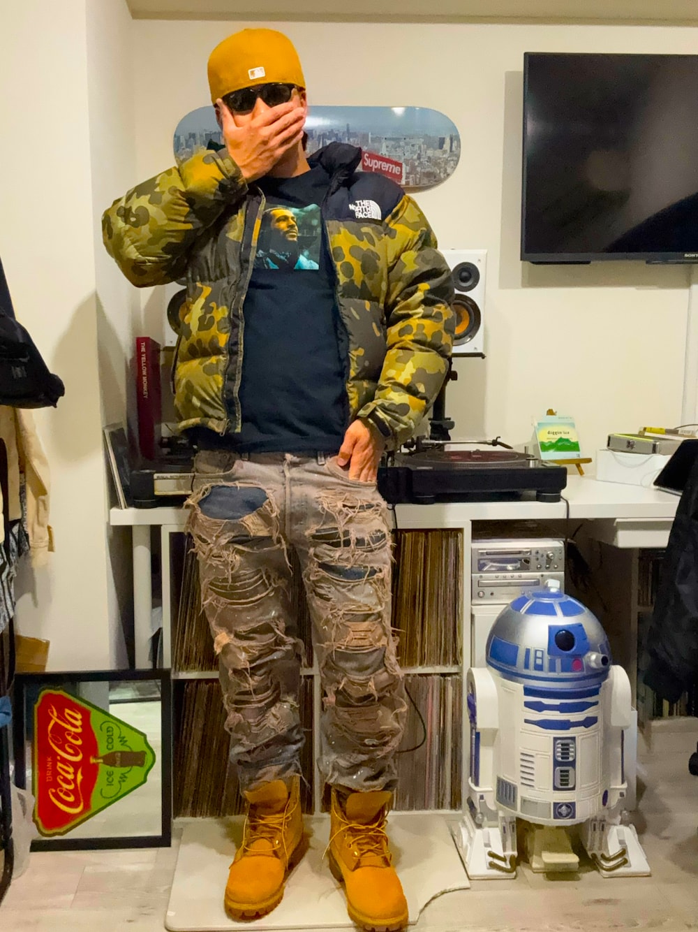 NEW ERA 59FIFTYとTimberlandのカラーで色合わせしました。 大好きなMarvin GayeはSupremeとのコラボです。 デニムはINNOCENCE NYC 雑にダメージされてるように見えますが、かなり計算されたデザインでお気に入りです。