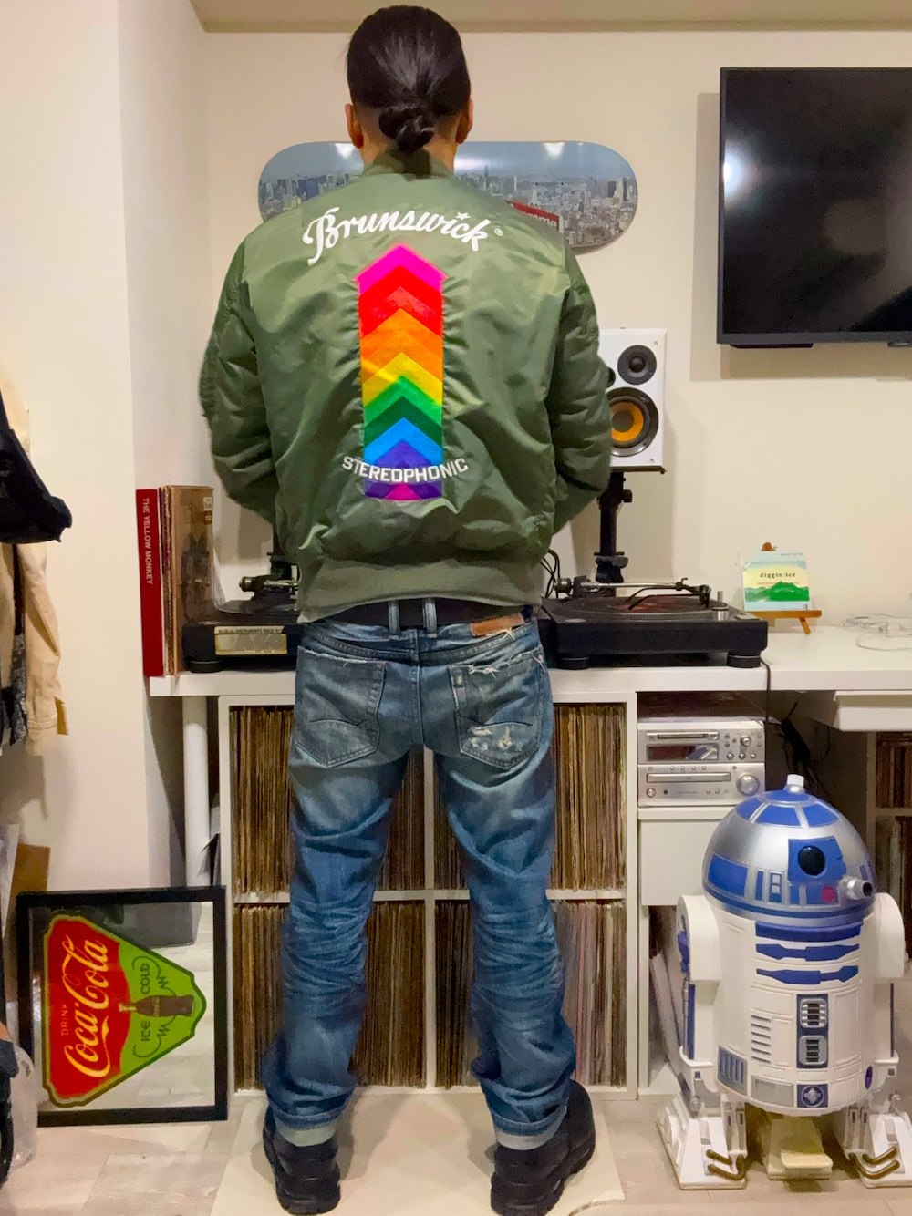 Soul Musicのレーベル「Brunswick」のMA-1 DJ MUROさんのブランド「recognize」と「AVIREX」のトリプルコラボです。 MA-1についてるタグは山下達郎さんのグッズです。 達郎さん、Brunswick好きなので勝手に付けました。 長年履いてるcult of individualityのデニムも良い味出していて飽きません NIKEのGOADOMEで締めました