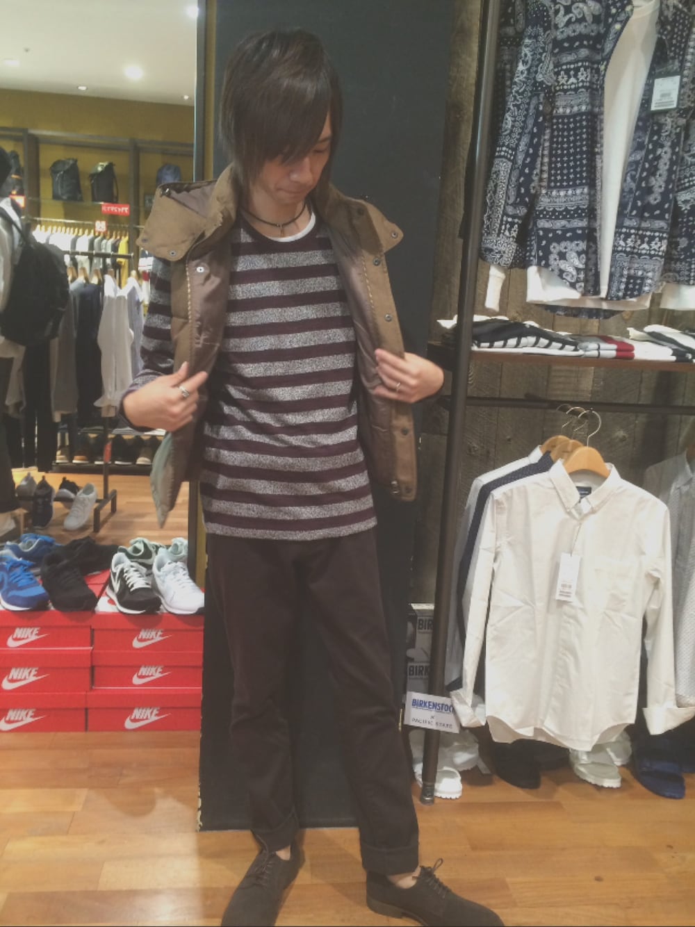 今回はカットソーコーデです! 赤とグレーのボーダーに ベージュ系のダウンベストを合わせて 秋っぽさの色でコーデしてみました。