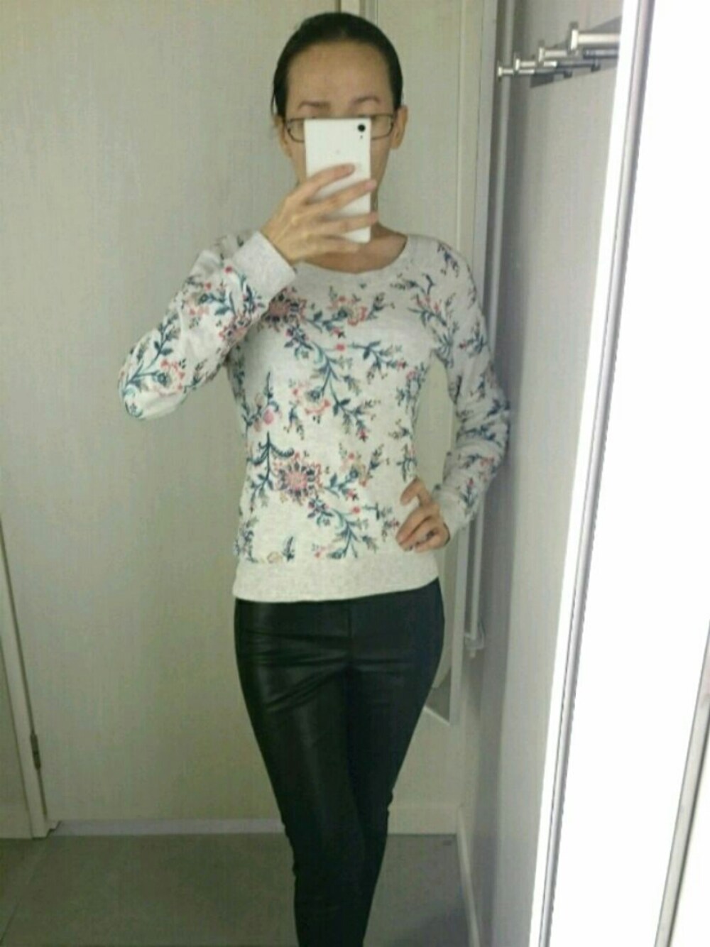 In love with this floral printed sweater pair with faux leather black pants for casual Spring outfit.