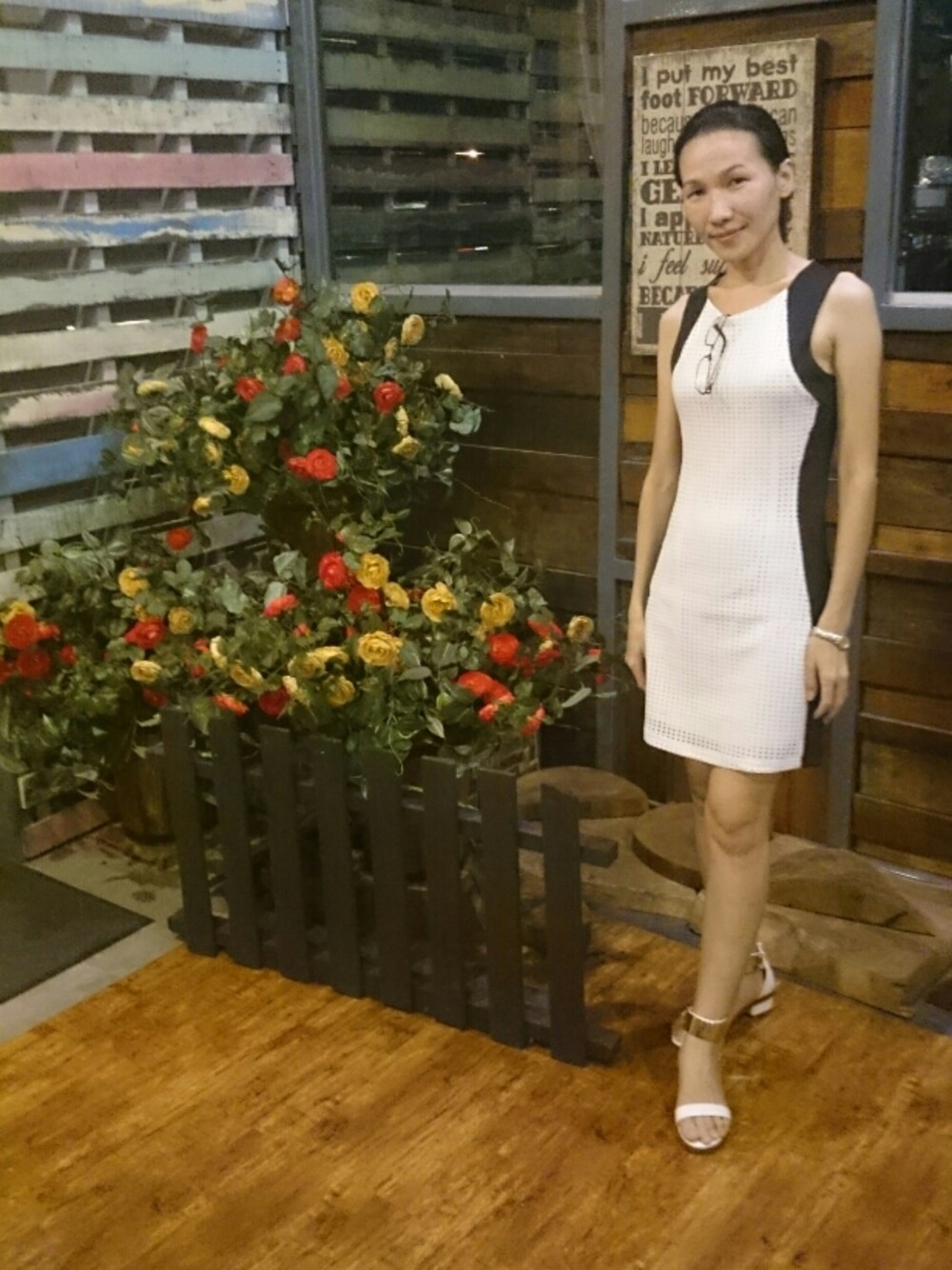Mono chic design on white textured panel dress plus classy design on white low heel sandals turn into a great outfit for attending business networking event in a relaxing atmosphere away from the office.