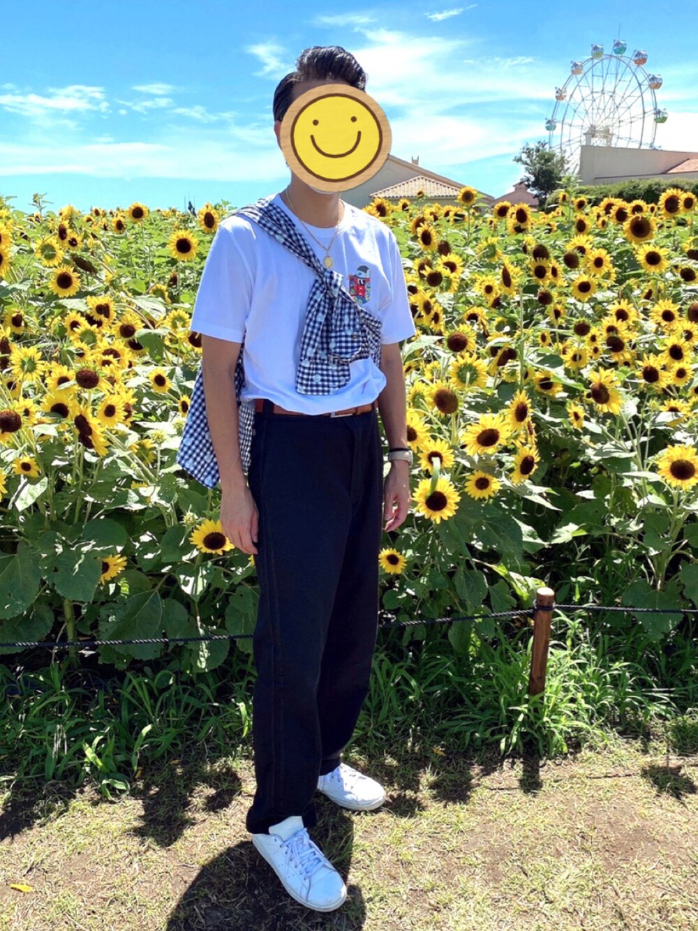 ソレイユの丘のひまわり畑! サイドライン入りパンツでキレイめ入れつつ足長に!