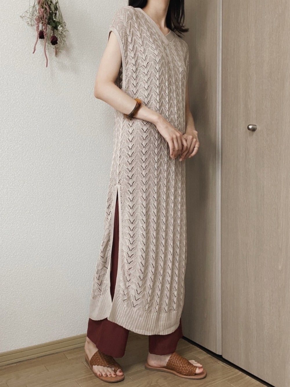 umeのワンピース「【VACANCY】レース編みニットロングベストワンピース」を使ったコーディネート
