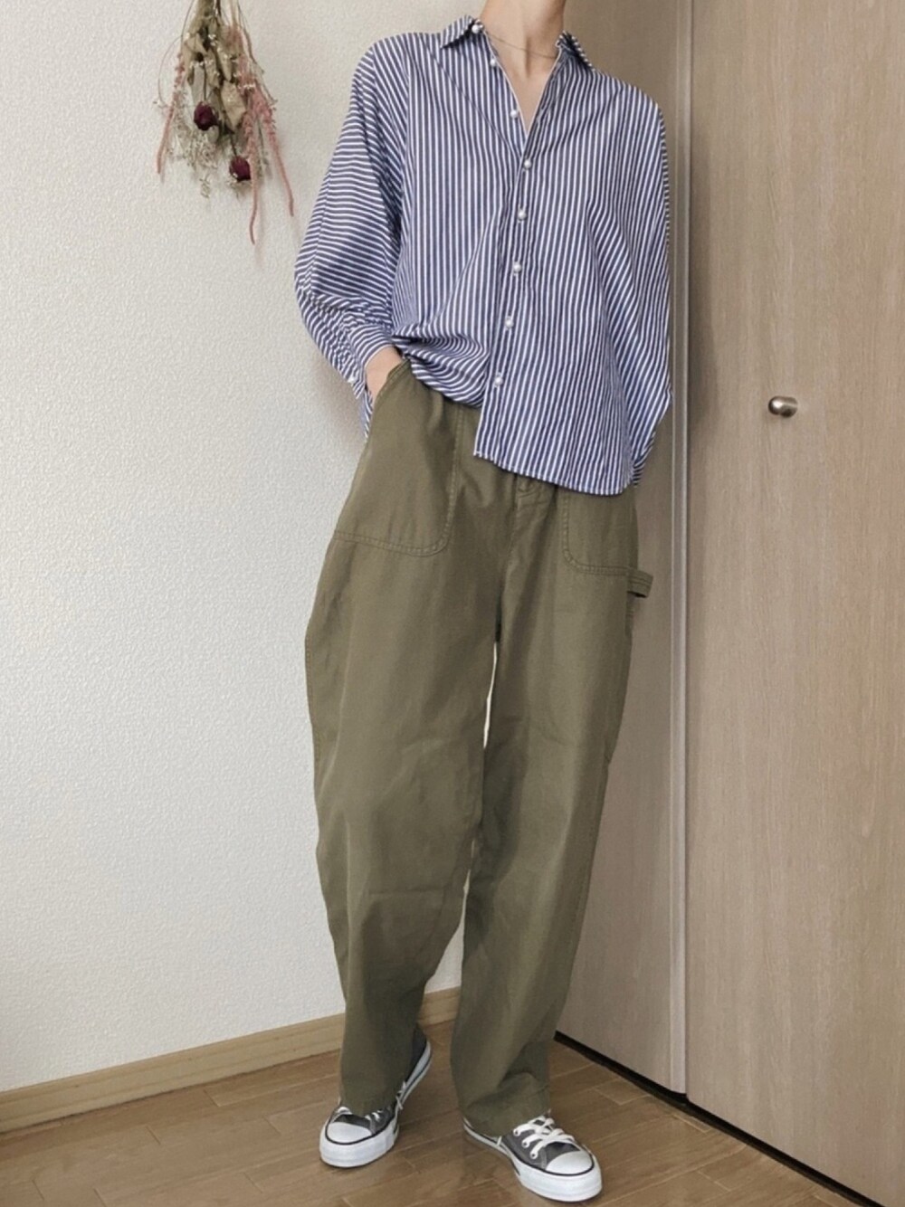 いいね、お気に入りありがとうございます✩ 上品なパールボタンストライプシャツに、あえてダボっとしたカーキパンツを合わせました☻ アクセはたくさん付けずシンプルなシルバーネックレスのみで💫