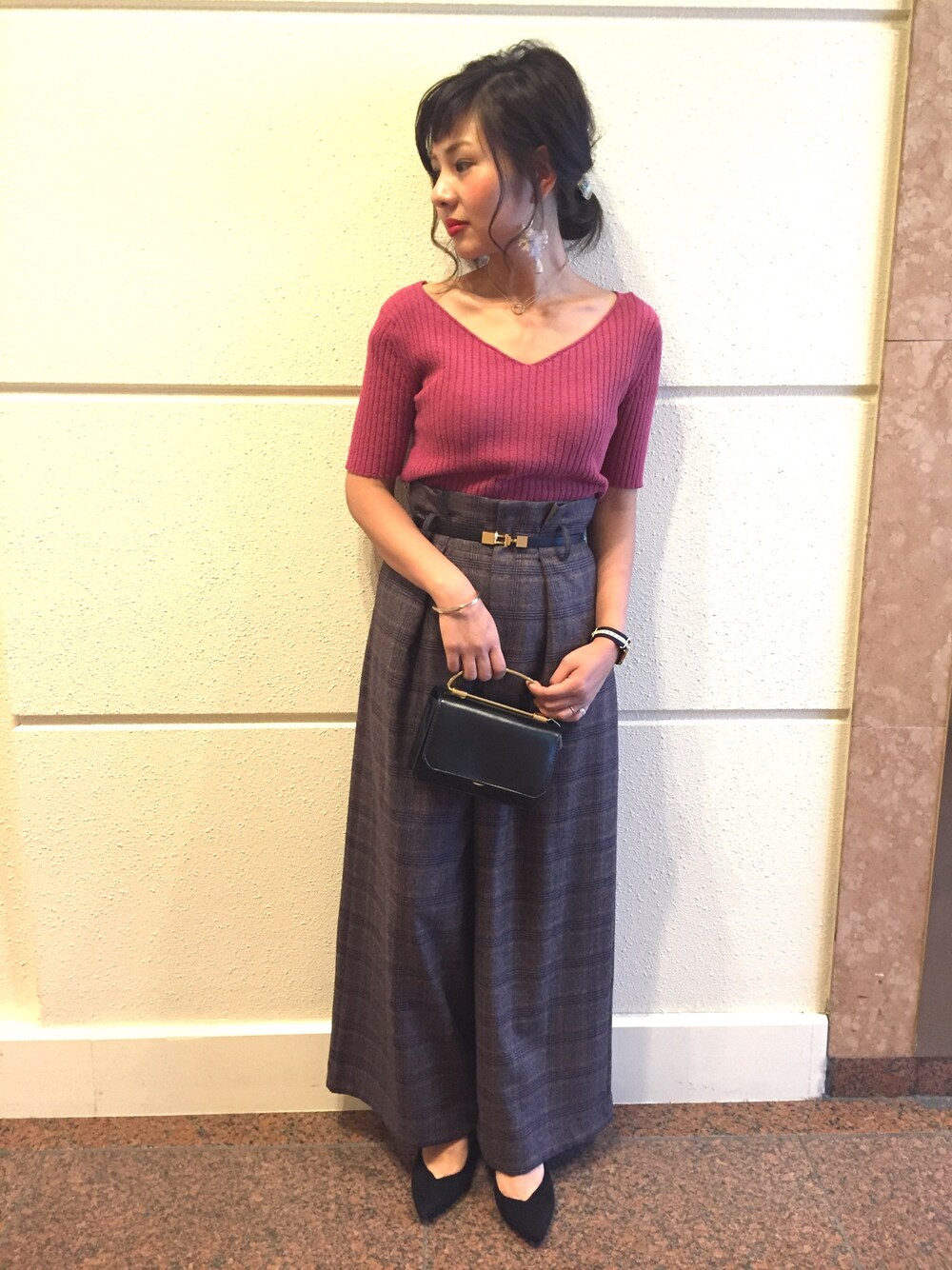 秋定番のグレンチェックはカジュアル過ぎない様にデコルテラインがキレイなVニットと♡ 全体的にシンプルにまとめて、差し色をプラス(o^^o)