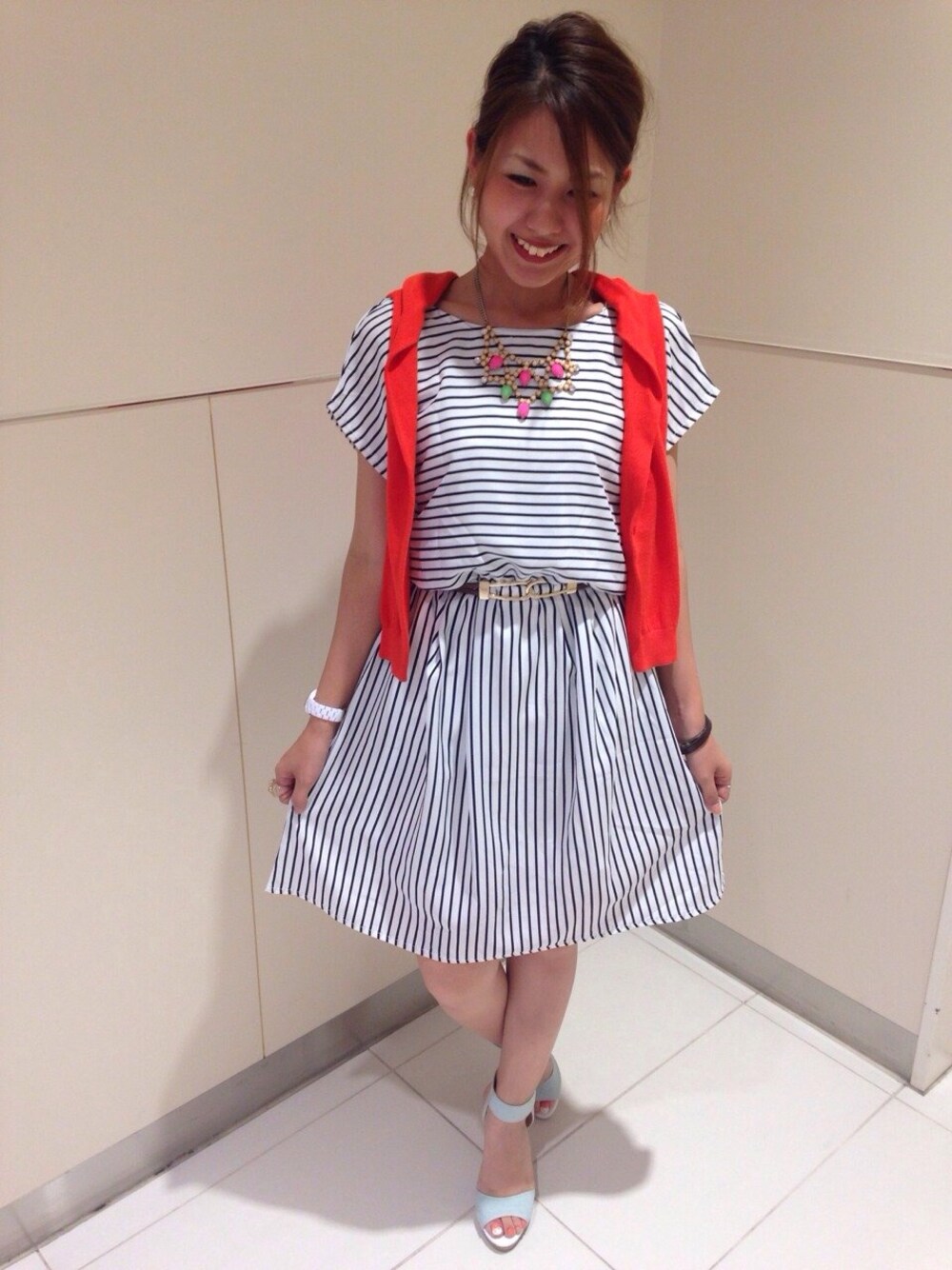 こもりんのワンピース「ボーダープリントデシンギャザーワンピース」を使ったコーディネート
