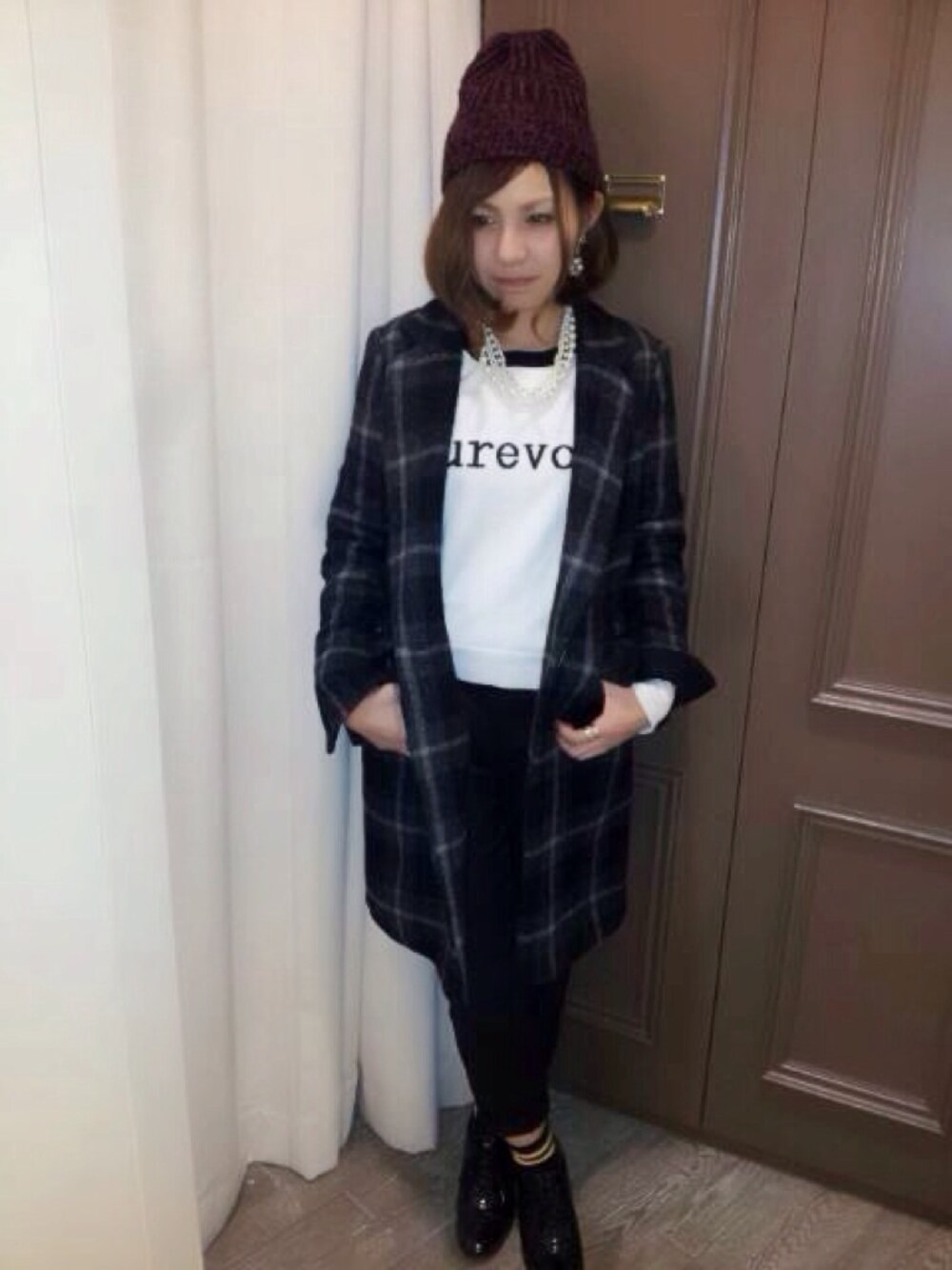 こもりんのチェスターコート「ダブルクロスチェックチェスターコート」を使ったコーディネート