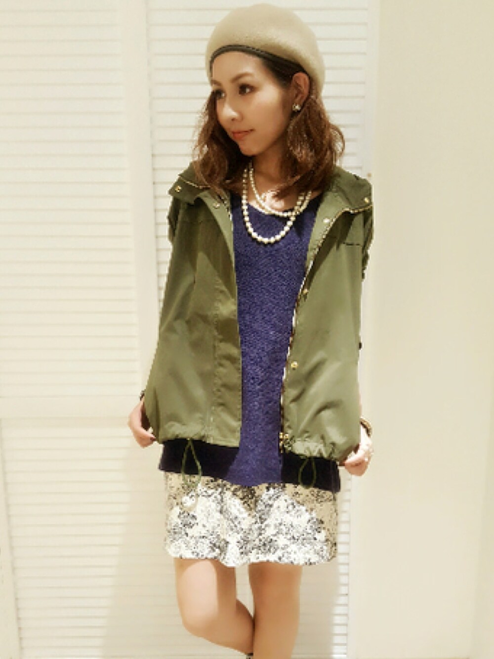 ミリタリーブルゾンのカジュアルコーデ☆ ネイビーにカーキ合わせはお気に入り(o^^o) ミディアム丈のブルゾンには少し短いスカートを合わせて低めのヒールもバランス良く🎶