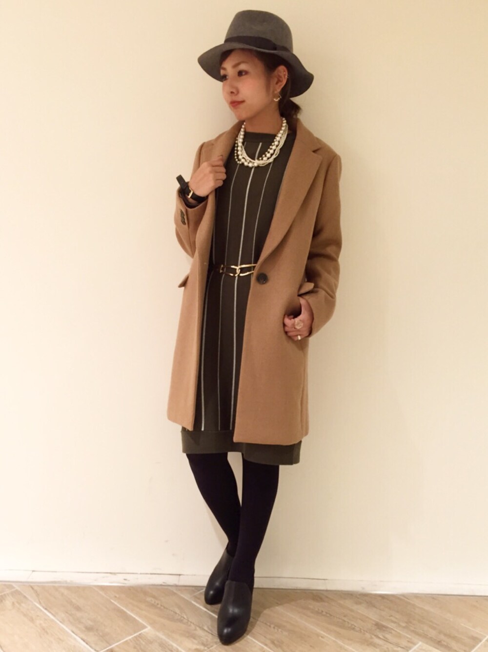 ストライプニットワンピのカーキにチェスターのキャメルを合わせたコーデ☆ ストライプワンピにモード感が出ないキャメルのチェスター合わせの大人っぽさが出せる組み合わせです! ニットワンピでのストライプ柄は新鮮さもありますよね!