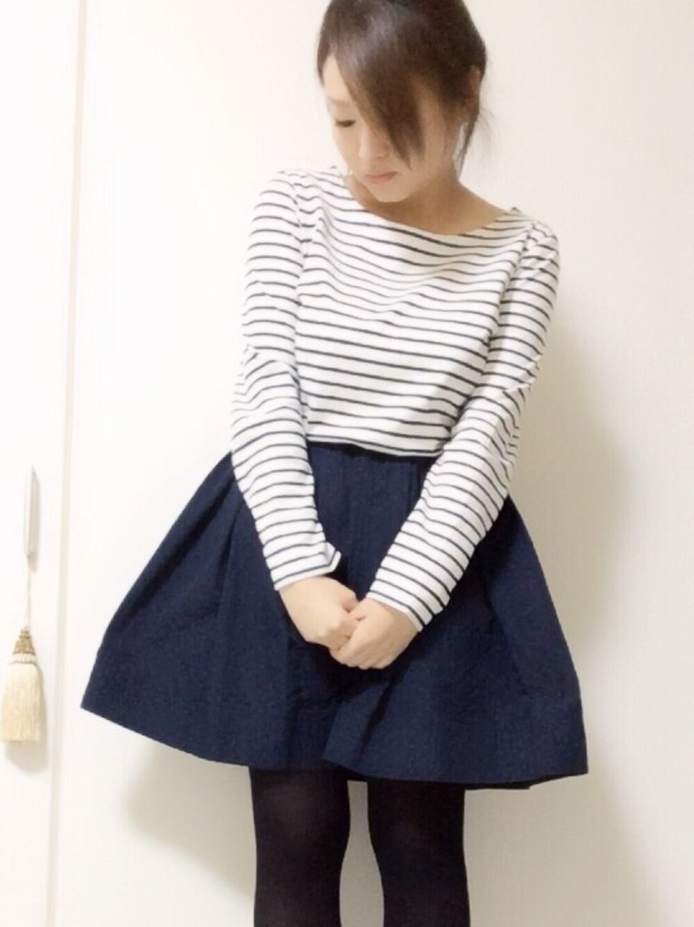 Tops...Eddie Bauer Skirt...BABYLONE Tights...Tabio Shoes...Converse 写真のサイズが全身うつるようにフィットしない。 みえないけどスカートはシャカシャカ素材のネイビードット柄でいいこちゃん風です。