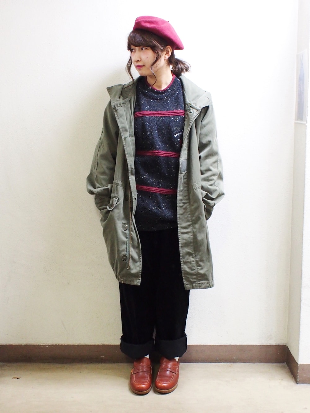 STAFFコーディネート (まみ) アウター : ミリタリーコート ¥9980+tax トップス : ニット ¥5980+tax パンツ : イージースラックス ¥5980+tax 帽子 : ベレー帽 ¥2980+tax twitter @lucent_furugi instagram @lucent_furugi お問い合わせは、twitterかinstagramのDMにて お願い致します。💐