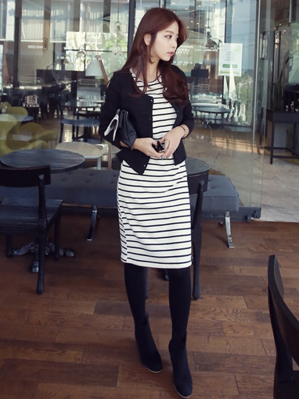 授乳服としても使える、ルクリアのマタニティワンピース&カーディガンを黒のタイツと黒のクラッチバッグを合わせたコーデです。
