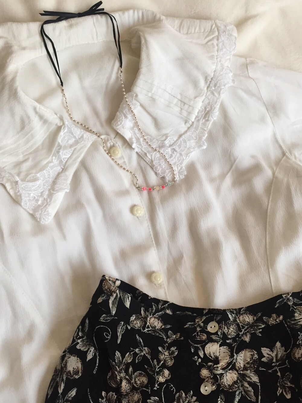 黒スカートとネックレスの黒リボンをアクセントに。 necklace: 小花のネックレス tops: used(GRAPEFRUIT MOON) skirt: used(GRAPEFRUIT MOON)