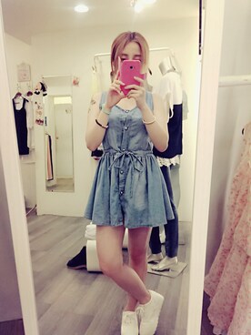 「荷葉袖氣質顯瘦拼接牛仔連身洋(ワンピース、ホワイト系)」を使った、路菲さん(レディース・151cm)の春コーディネート