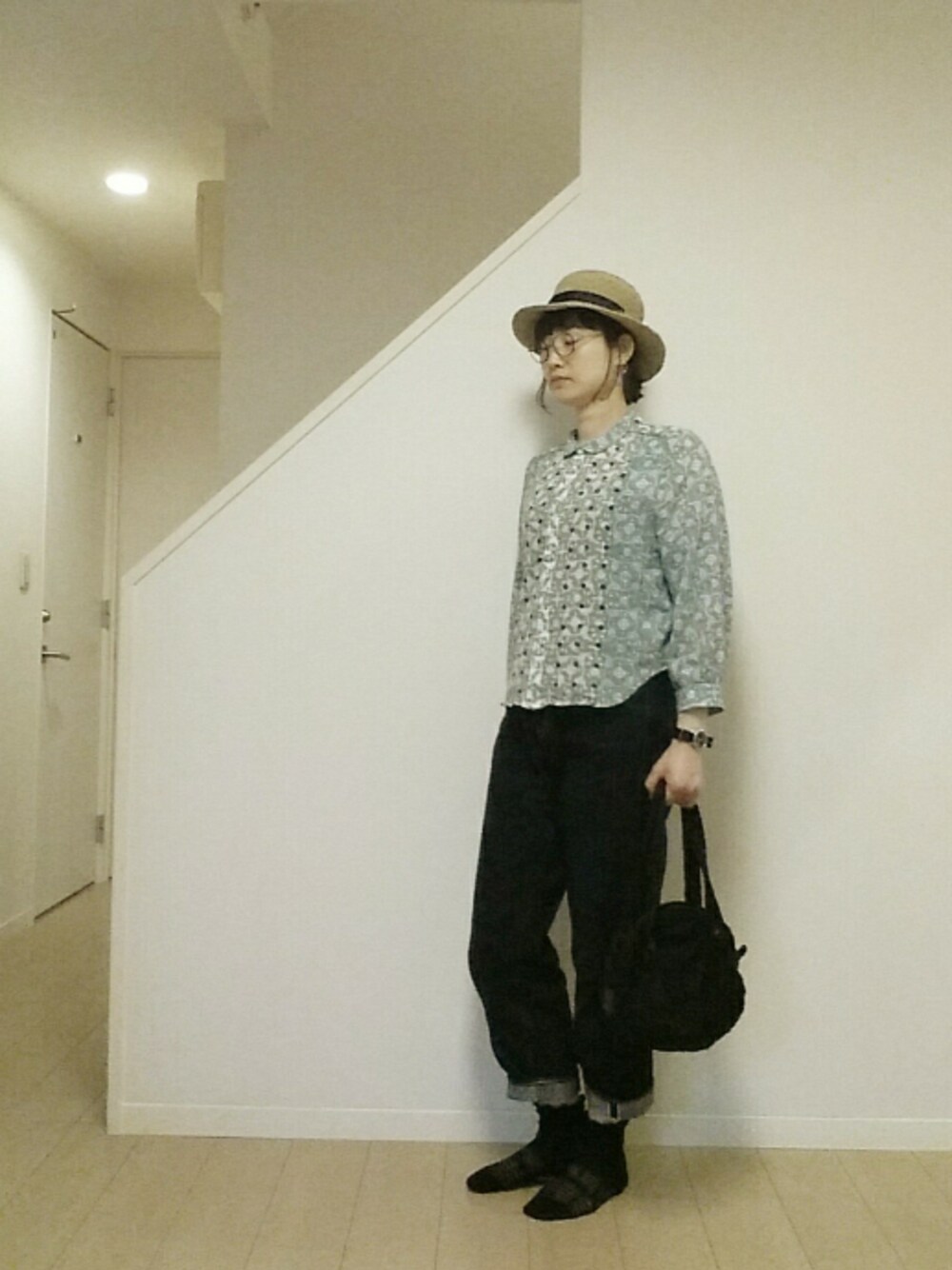 柄のシャツを着ると、柄の悪い人に見えるのではないかと、ちょっとソワソワします。 シャツの柄の中に黒のドットが入ってるので、帽子のベルトや小物は黒で揃えてみました🐼