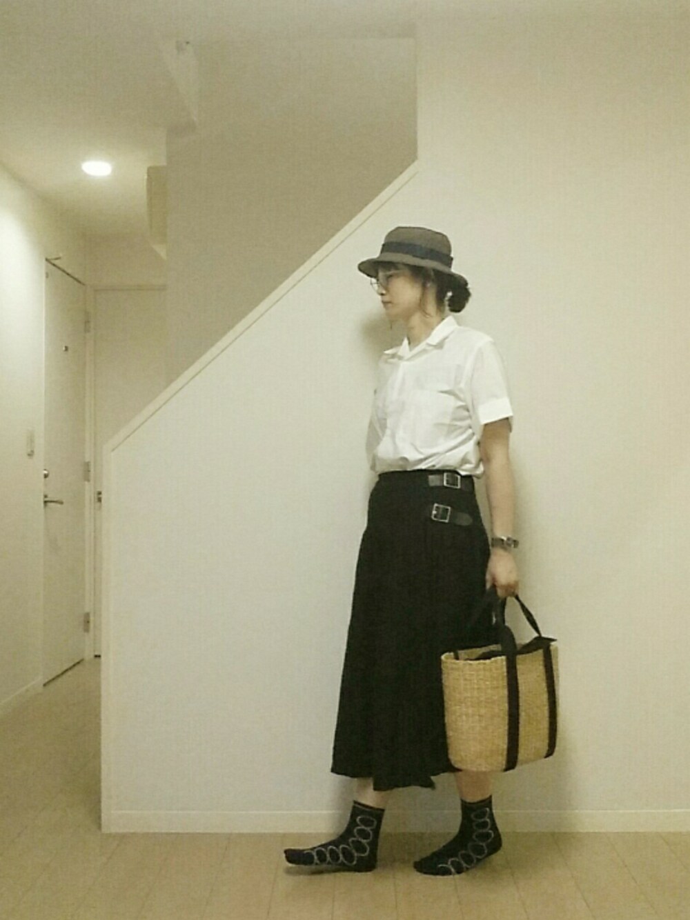 開襟シャツとロングプリーツはモノトーンを着て。 ピアスと時計のベルトをカーキにして、小さな所で色物にチャレンジしてみます。 いつもならシューズを黒にしちゃうけど、今日は白いレザーシューズをはきました。