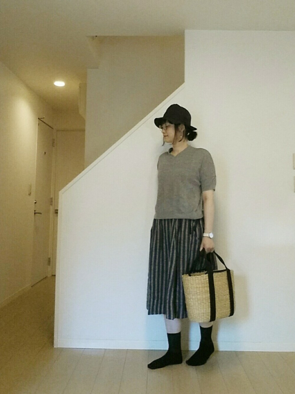 グレーのニットにグレーのストライプスカートで、安定の地味色コーデ。 地味な色ばかり着ていると、脳が老化してしまうそうな😱