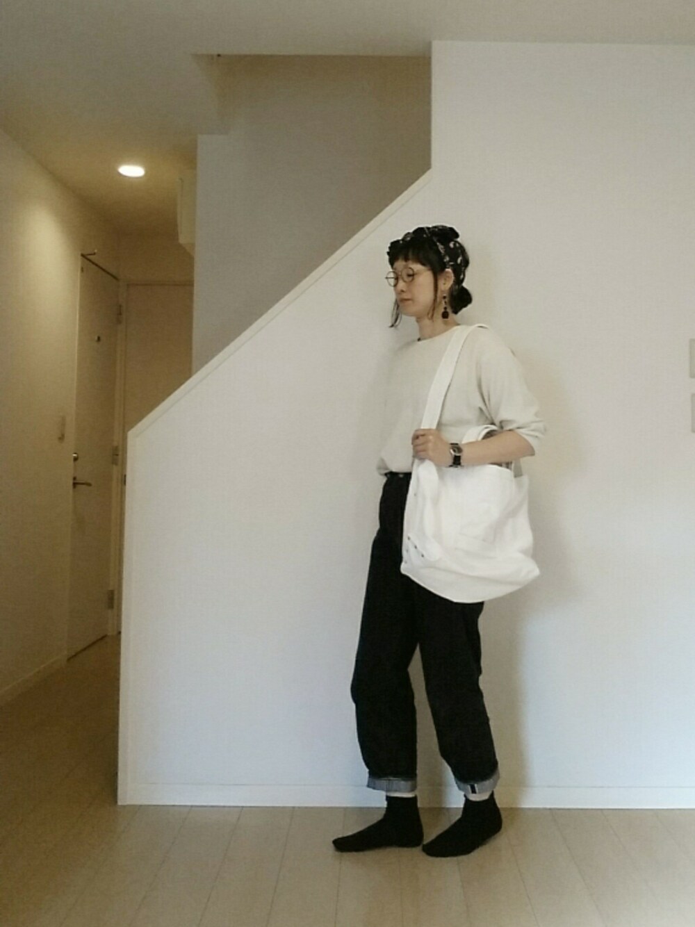 バンダナスカーフを、思いきって頭の上でリボンに←ドキドキ 顔が地味なので負けないように、おおぶりのピアスもつけてみました。 ワッフルTがやっぱり着やすいので、色ちがいを買い足しました。