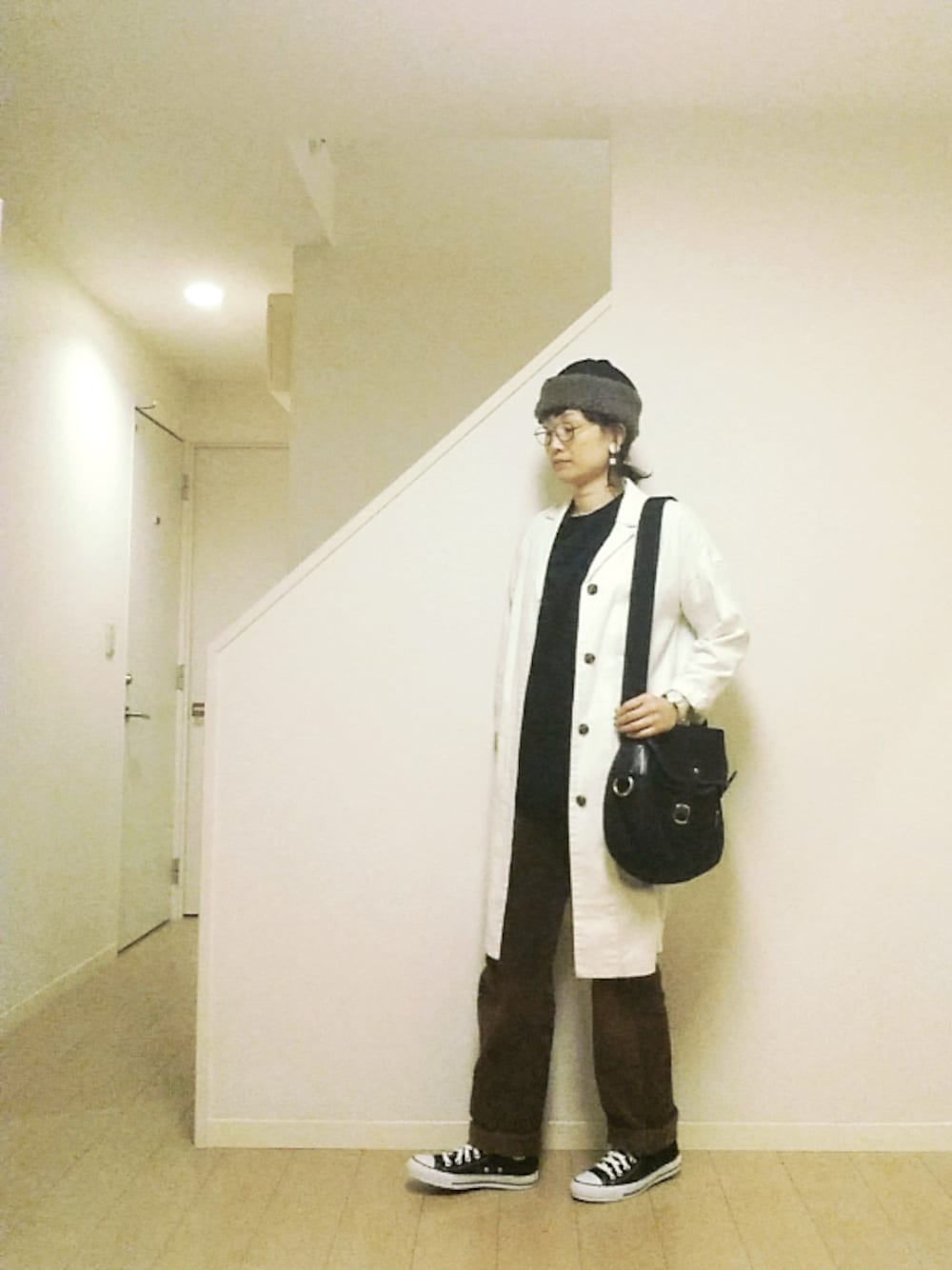 お医者さんみたいなコート。 中は、ブラックのスウェットと、ブラウンのコーデュロイパンツ。 パンツはパパが昔はいてたやつがサイズアウトしたので、私がお下がりをもらいました。 私のサイズアウトしたお洋服は娘へ。 家族みんなで成長中←ダメなやつ。
