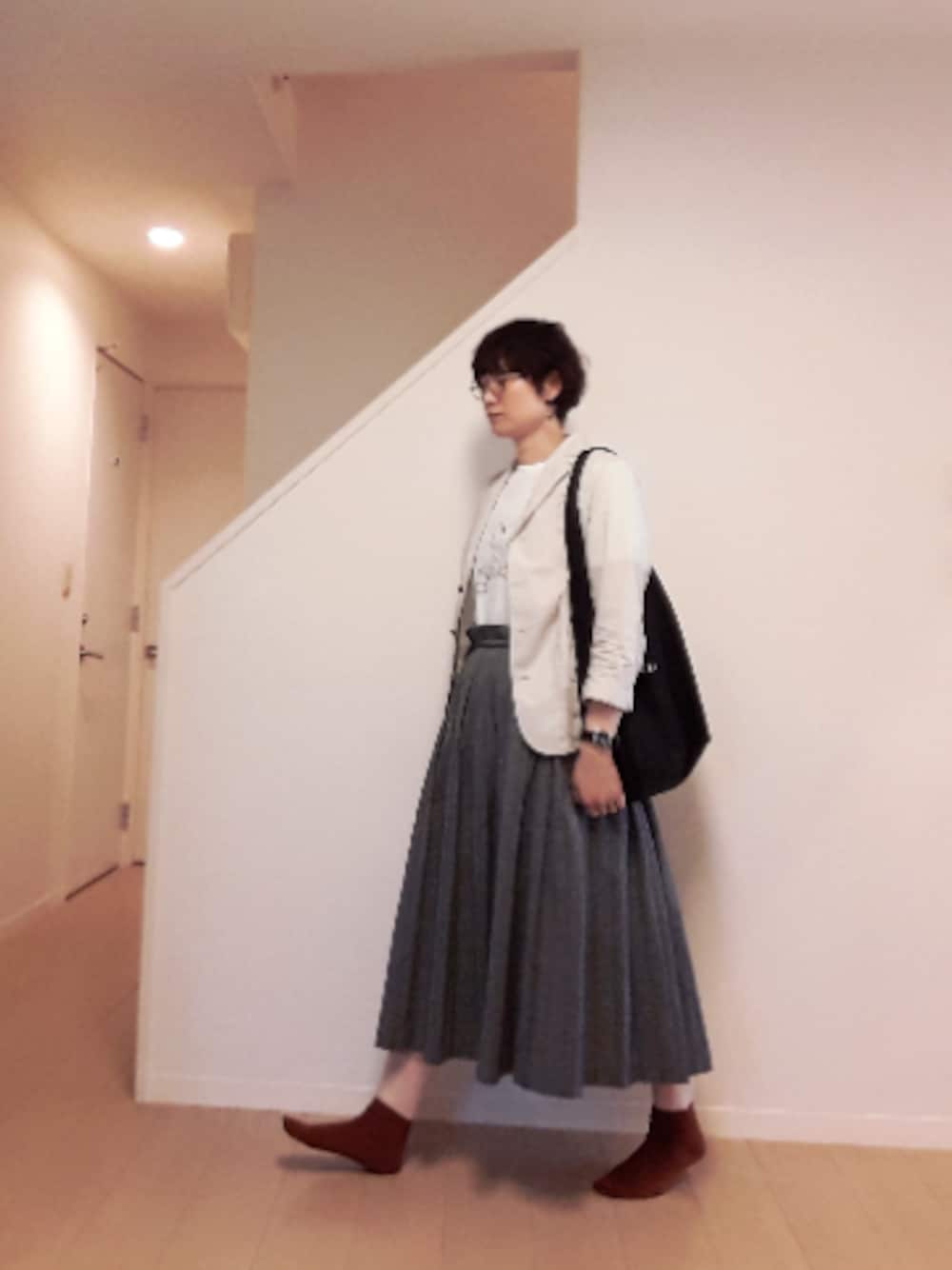 プリントTにジャケットとロングプリーツスカートを合わせました。 このプリントは仕事ではアウトかなぁと思ったけど、誰にもつっこまれなかった✌ 今度はジャケットなしで着て行ってみようか😁