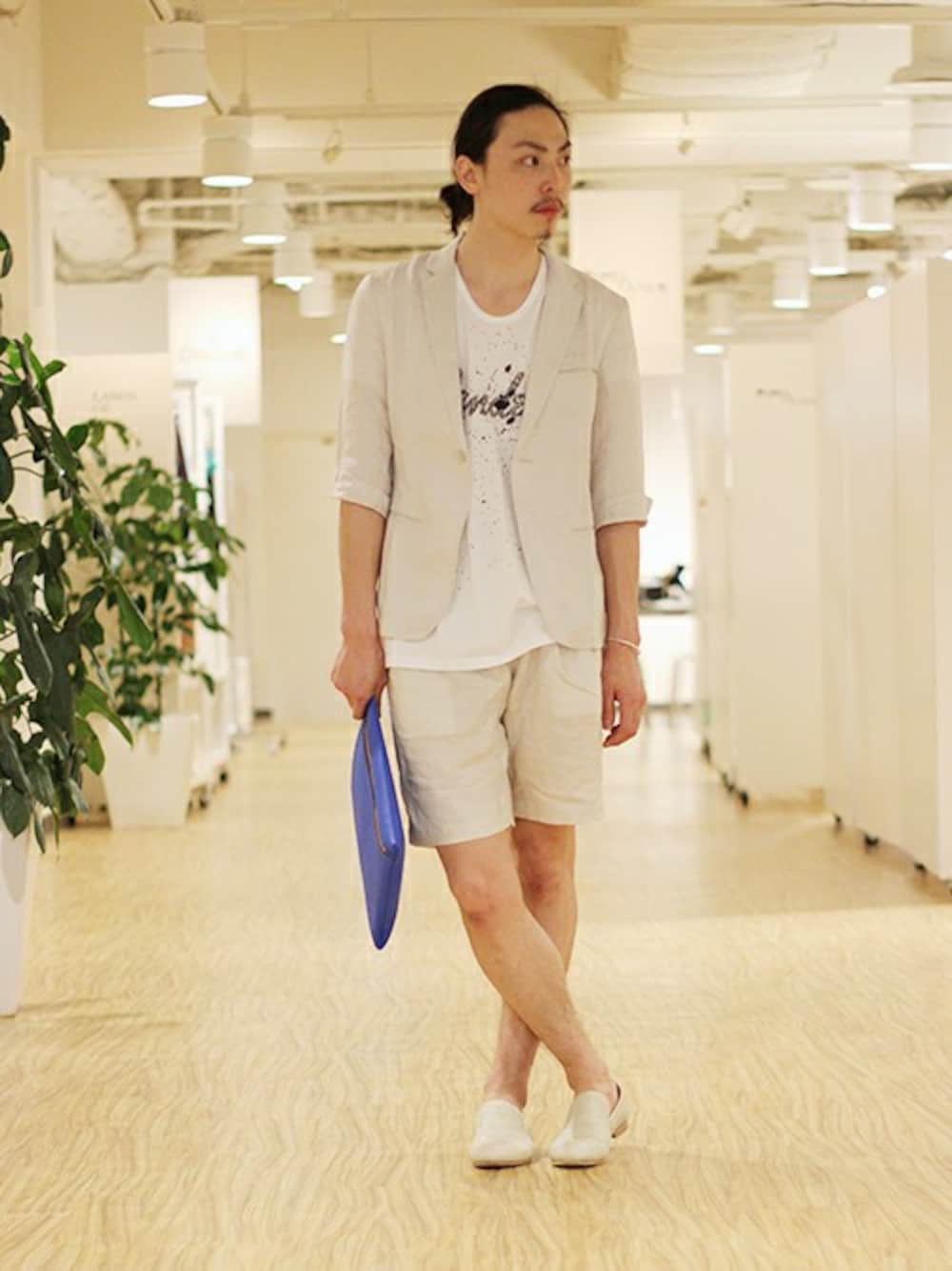 Lui'sオリジナルの麻テンセルJKを使ったコーディネートです。 光沢のある麻×テンセルの素材を使用したシャツライクなジャケットは これから真夏にかけて非常に長いシーズンで着用できる羽織物です。 同じ素材のショートパンツを合わせました。