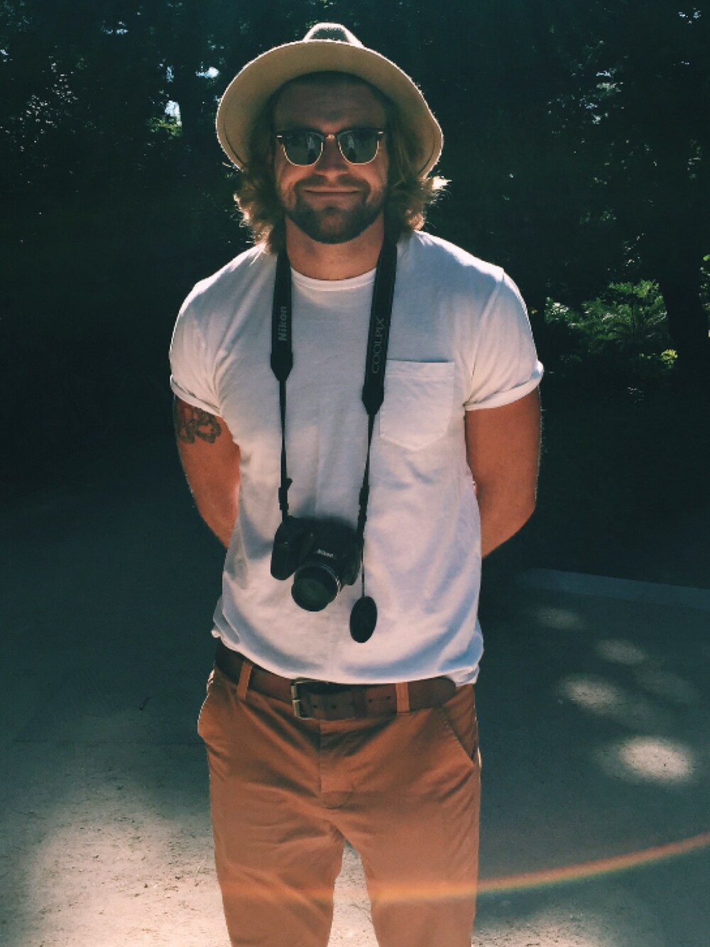 Casual vacation outfit in Madrid. Hat and chinos from urban outfitters. White tee from j crew, I have so many of these in so many colors. They're perfect.