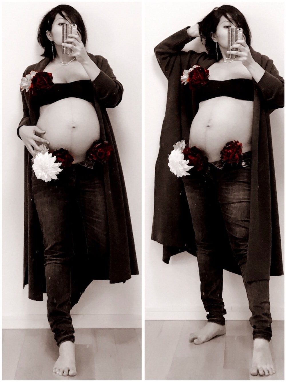 臨月の記念に自撮り撮影 マタニティフォト 自分の挙式に利用した花飾りを利用して こぅいう写真を載せるのは 賛否両論あるんだろぅけど、記念に。 …って 1年2ヶ月前と同じ事してみました ポージングも文言も一緒。