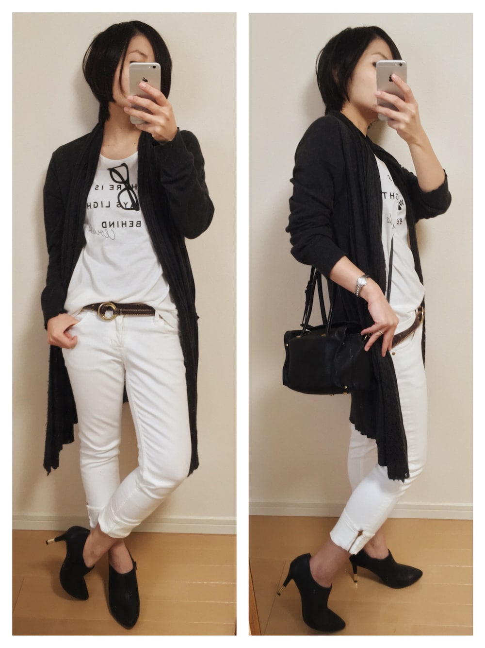 夏はホワイトコーデを満喫 シーズンが変わってカーディガンをプラス クロをいれると引き締まる