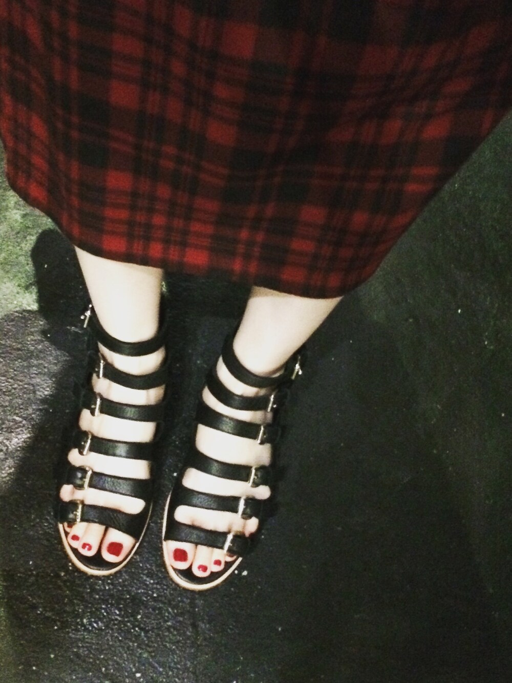 珍しくペタンコサンダルです。 チープなスカートと合わせて気楽なコーディネート。