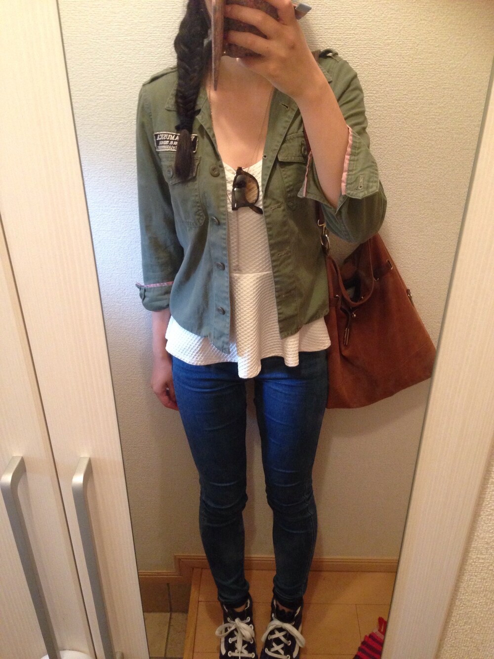 スキニーはUNIQLO ペプラムはアメリカで買いました ミリタリージャケットはMAJESTIC LEGONで二年前に買いました スニーカーはアメリカのUrban Outfittersで買ったVansのインヒールスニーカーです!
