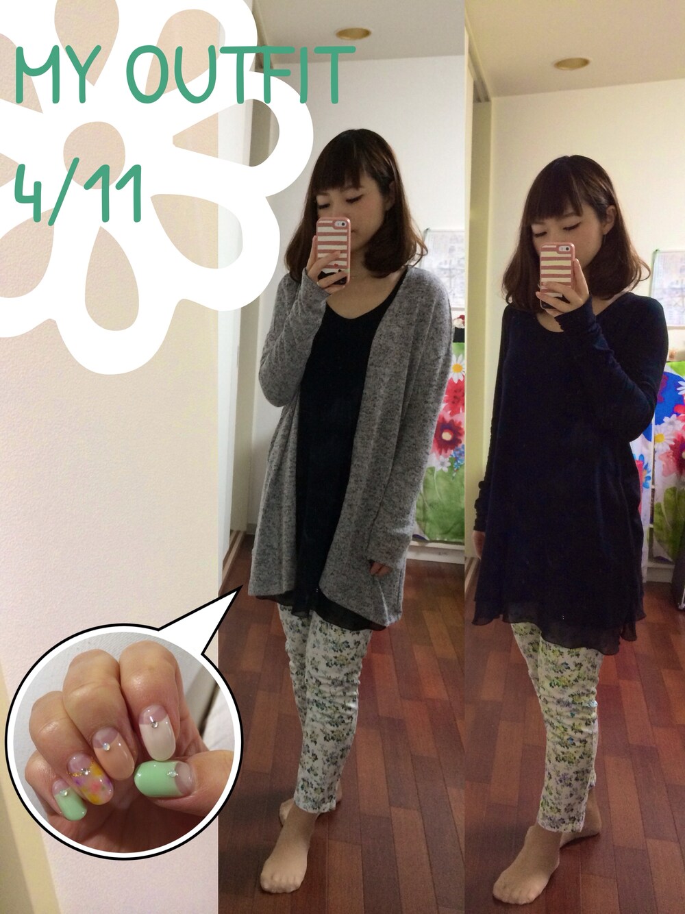 少し肌寒いのでカーディガンがあると便利。 ネイルは春ネイルでスモーキーパステルを使ってみました。印象派的な花柄がかわいい♡
