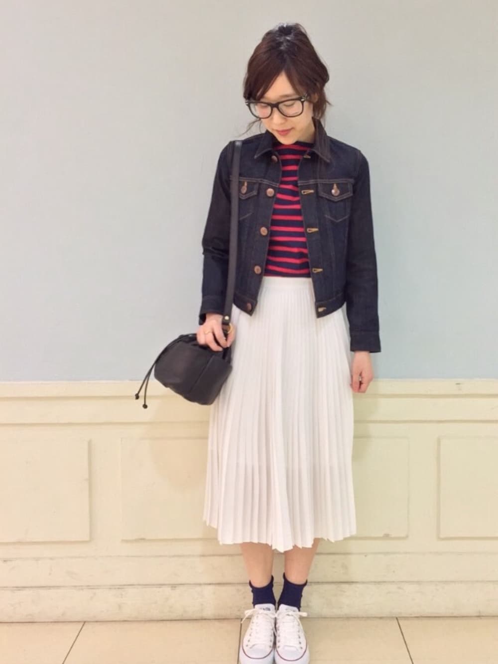 ひざ丈のプリーツスカートをデニムジャケットとスニーカーでカジュアルにコーディネートしました★