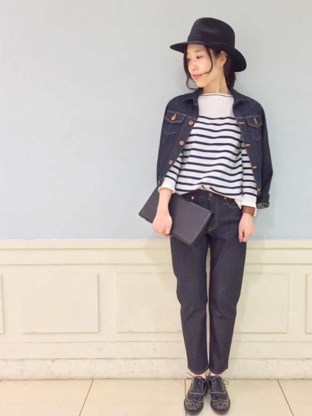 GジャンとデニムはRED CARD。インナーにカトルナフのボーダーニットを合わせて軽さを出しました★小物は黒で合わせてスッキリと★