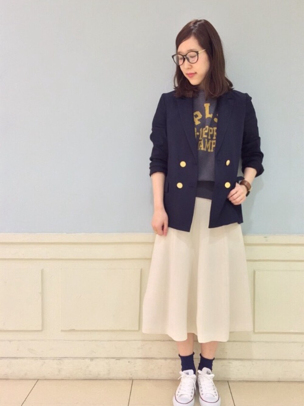 春のジャケットスタイルです。 チャンピオンのスウェットに白のスカートでランディらしいコーディネートです★
