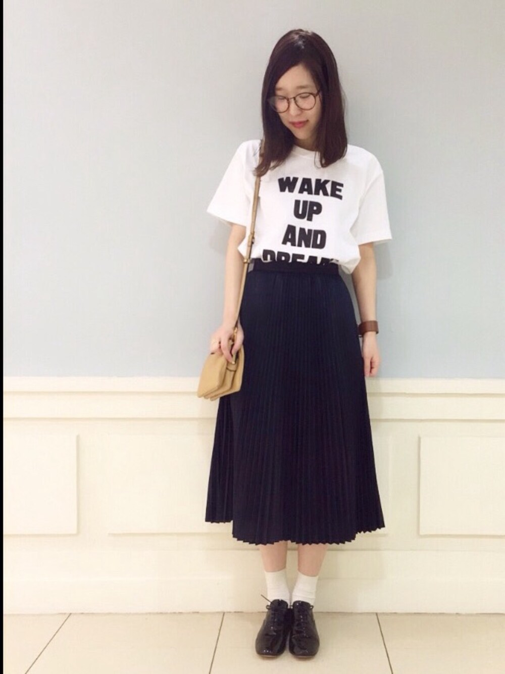 ビッグサイズのTシャツをプリーツスカートで女の子らしくコーディネート。