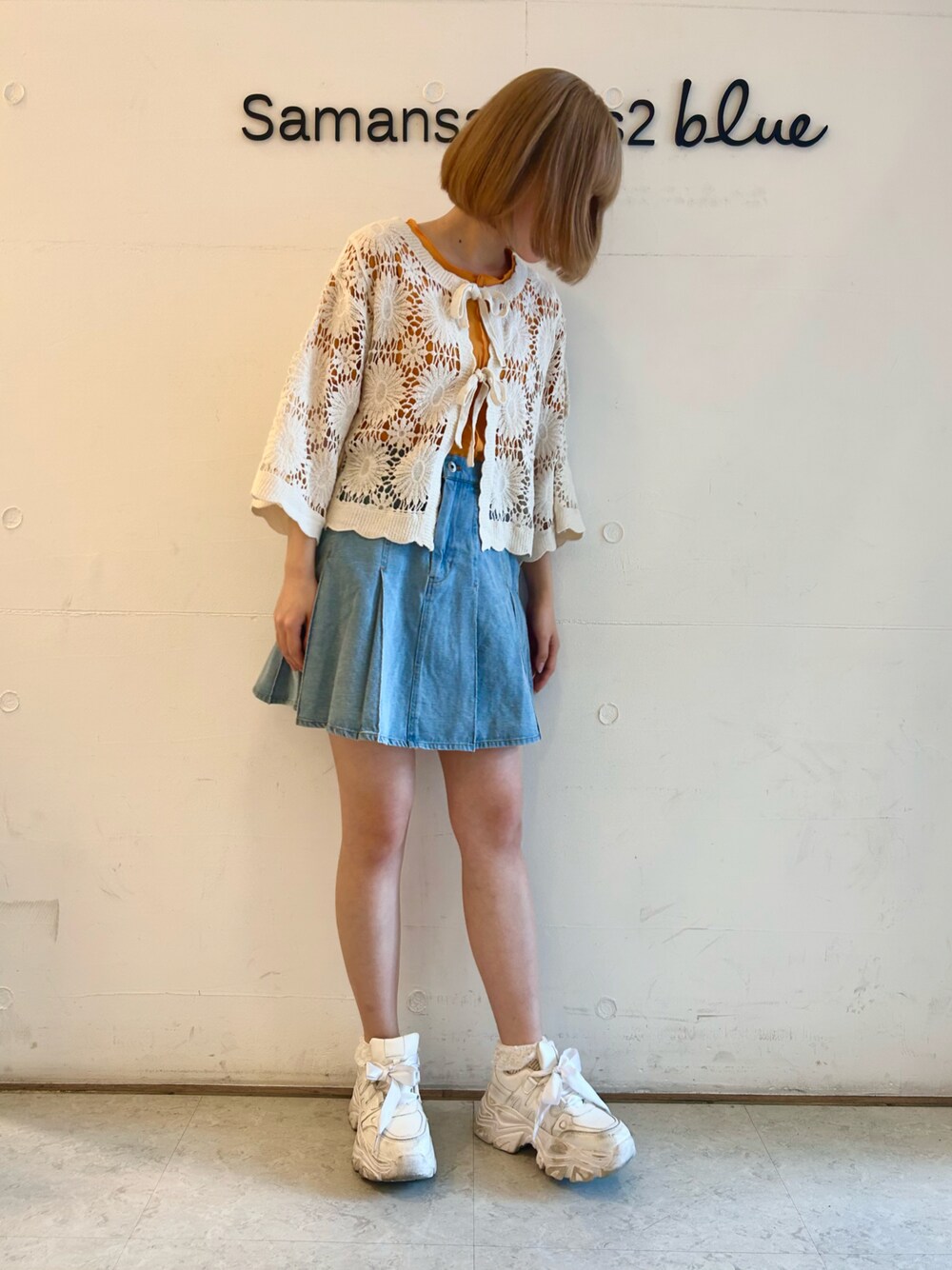 夏らしいビタミンカラーを取り入れたコーデです🍊 デニムのプリーツスカートは着回ししやすく丈も短すぎ無いため高身長さんでも履きやすいです◎