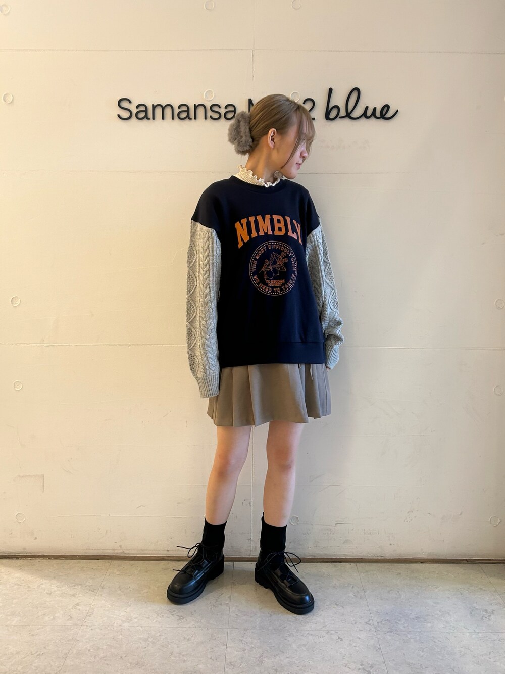 ゆったりめのスウェットとサイドプリーツのミニスカートのカジュアルガーリーコーデ ゆったりめのスウェットはリメイク風でお袖がニットになっていて可愛いです◎ サイドプリーツのスカートはふわっと自然に広がるシルエットになっています