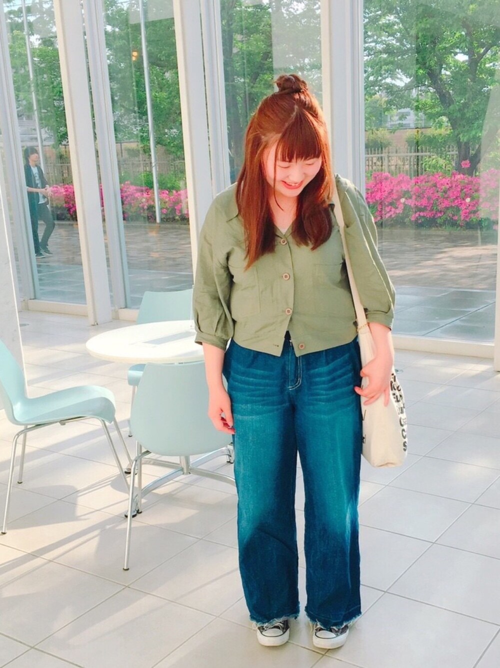 今日の大学でのコーデ🙏🏻 w closetのこのトップスは春のアウターにもなるしシャツとしても使えるしで、とっても役に立つトップスなんです〜😂💓 ちなみにバックスタイルは編み上げになっててめーーーーーっちゃかわいいです(*^o^*)♡♡ デニムワイドはまたまた古着〜! コンバースもアメアパのトートバッグは持ってて損なしアイテムです〜!!!