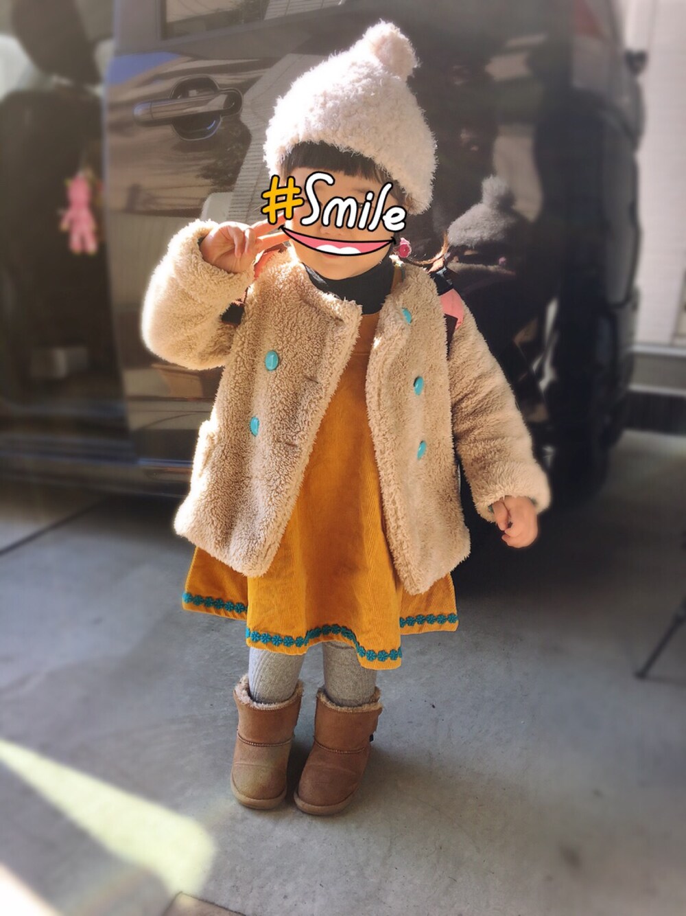パパの実家に遊びに行くのでおめかしスタイル♡ 普段なかなか着る機会のないワンピースを着せてみました。 本人お気に召したようです♡♡ しまじろうを連れて行くと言うので1歳のお誕生日に一升餅を入れた名前入りリュックにしまじろうを入れて行きました(≧∇≦) 帽子とアウターは自分でこれを着ると言ったのでこうなりました☆