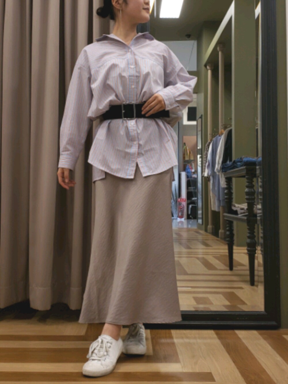 ご覧いただきありがとうございます🌿 春はサテン調アイテムで一気に垢抜け🙌🏻♥ シャツチュニックは太めのベルトで締めてもたつかず脚長効果を狙います🏹