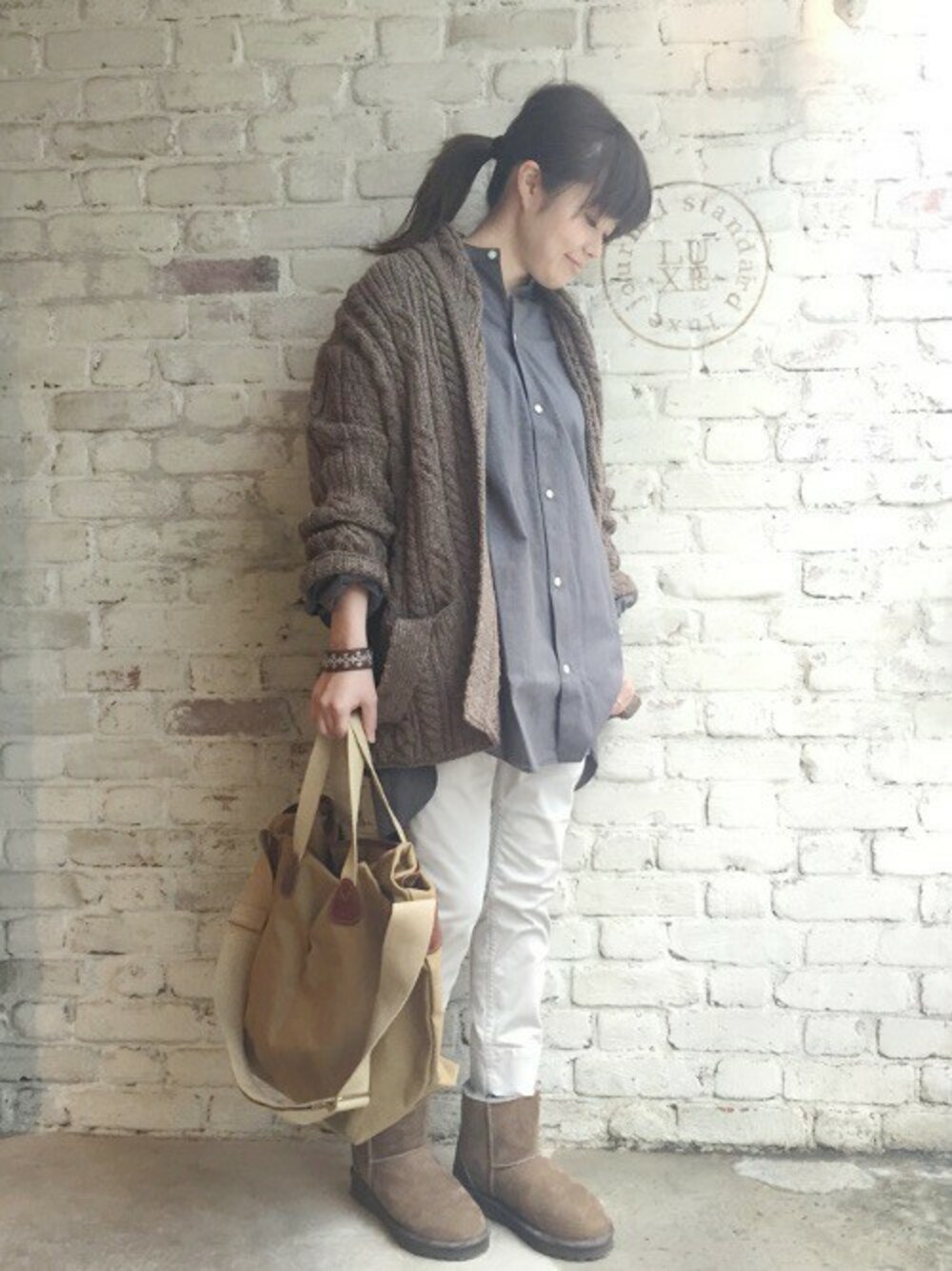 ムートンブーツで大人カジュアルスタイル♪ 冬の着こなしに欠かせないムートンブーツ。 カジュアルな大きめバッグをプラスするのが今年おすすめのスタイル。