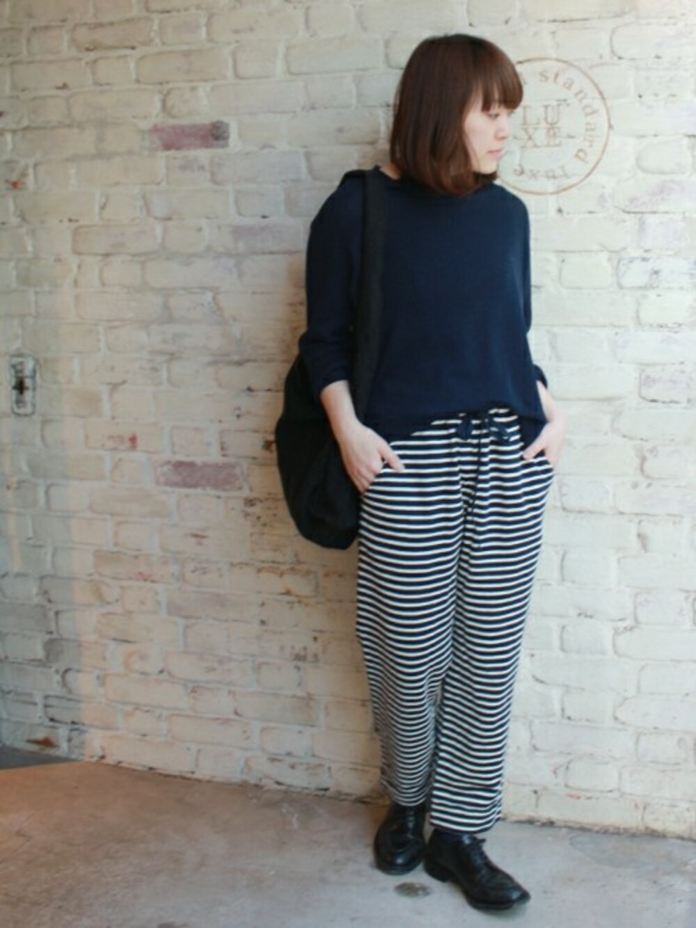 ボーダーパンツをポイントに◎ 一着でラフな着こなしを叶えてくれるボーダーパンツ。 シンプルなネイビーニットと合せてパンツを主役に◎