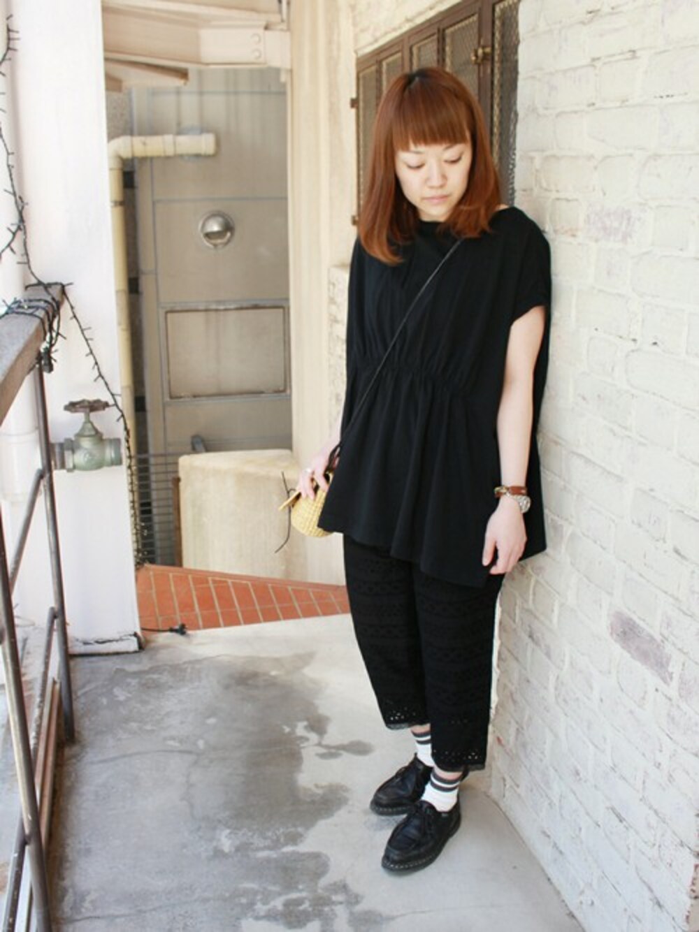 オールブラックコーディネート ブラックでまとめた着こなし。 カゴバッグをななめかけして、カジュアル感をプラスしてます。 足元は、マニッシュにまとめて甘さを調整しても◎
