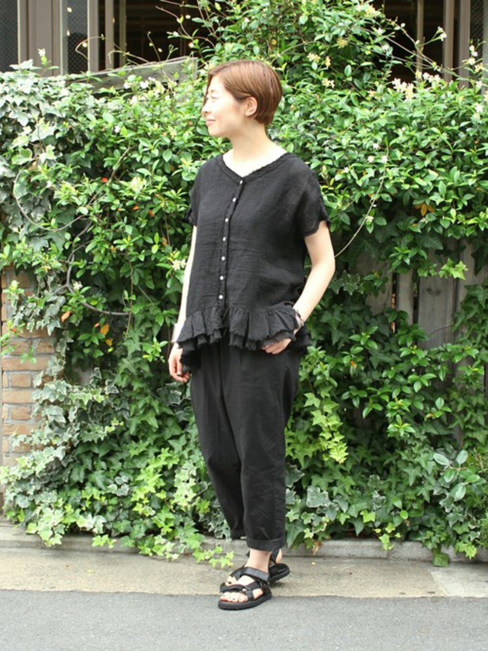 ブラックコーディネート シックにブラックでまとめた着こなし◎ 足元はラフなサンダルでまとめて。